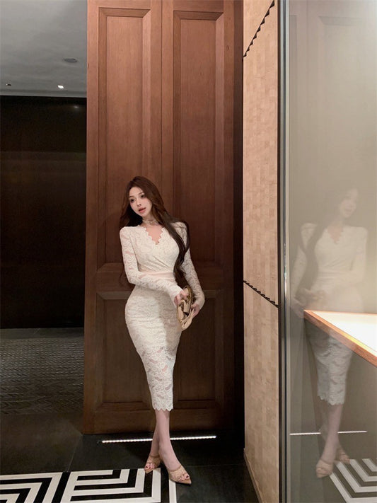 NA+ 蕾絲純欲女神 性感縷空醋酸裙 白