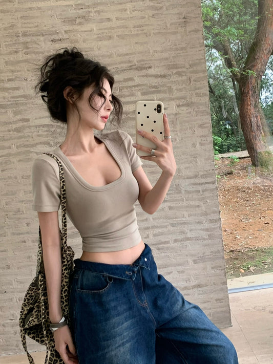 【Na+】不顯多 歐美百搭大U領顯瘦短T 卡其/粉