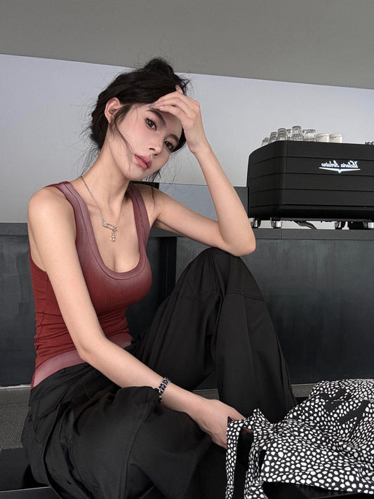 【Na+】仿水洗漆漸變彈力修身背心 灰/紅