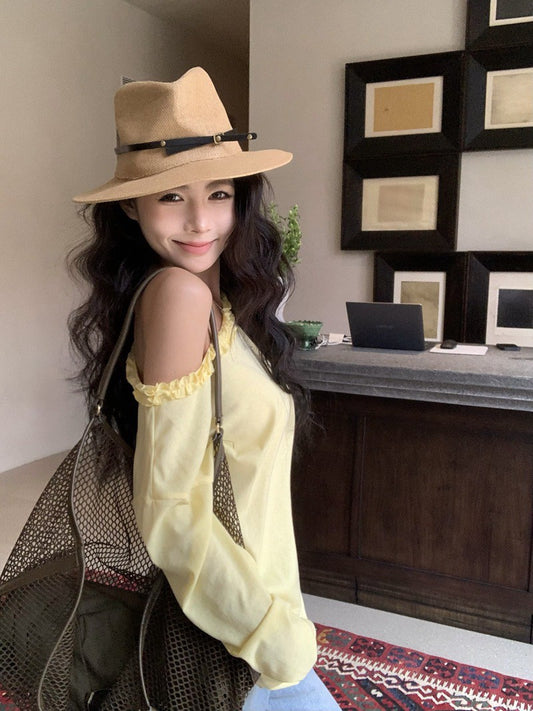 NA+ 推薦款*休閒花邊斜領寬鬆慵懶上衣 黃
