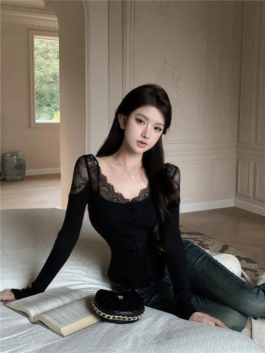 【Na+】御姐白月光 氣質蕾絲拼接針織上衣 黑