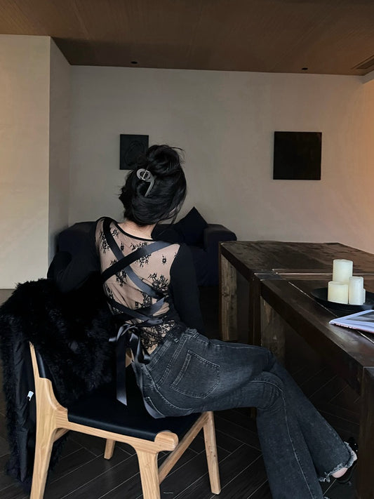 【Na+】性感蕾絲拼接蝴蝶結綁帶上衣 黑