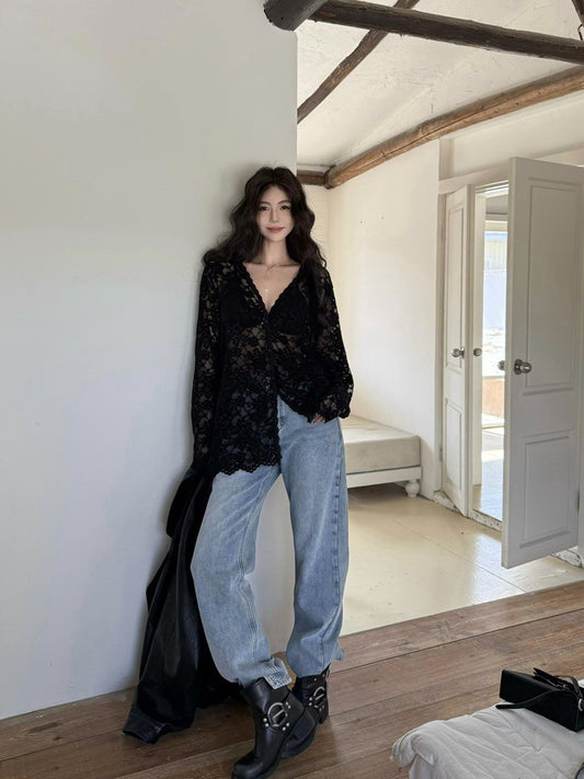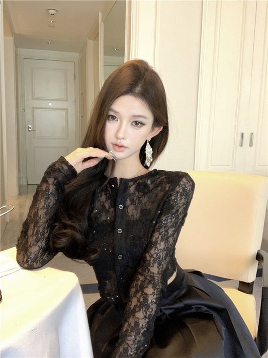 "Na+"暗黑女神 復古絨毛貂花縷空襯衫