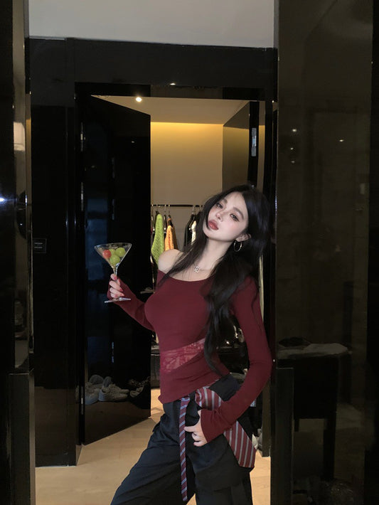 NA+ 辣妹半截縷空拼接露背綁帶上衣 紅/黑