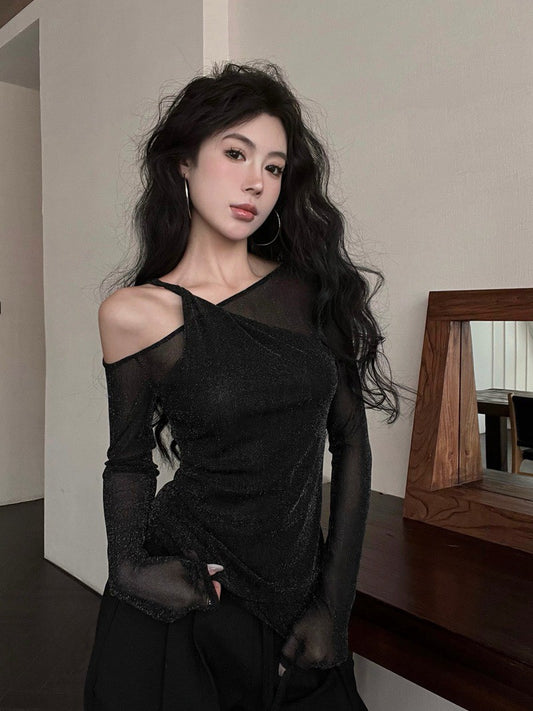NA+ 閃耀辣妹碎銀針織露肩上衣 黑