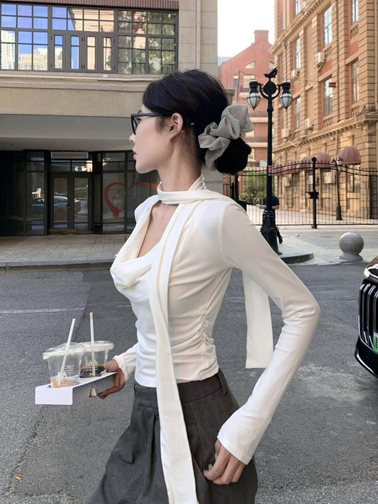 NA+ 戚薇御姐蘯領飄帶V領緊身上衣 白/黑/卡其