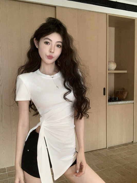 Na+ 簡約圓領側腰開叉顯瘦上衣 白
