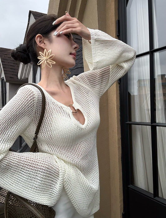 Na+ 時髦歐美老錢 V領縷空疊穿罩衣 米白