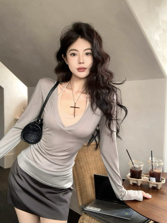 Na+ 休閒百搭 冰肌天絲V領上衣 灰