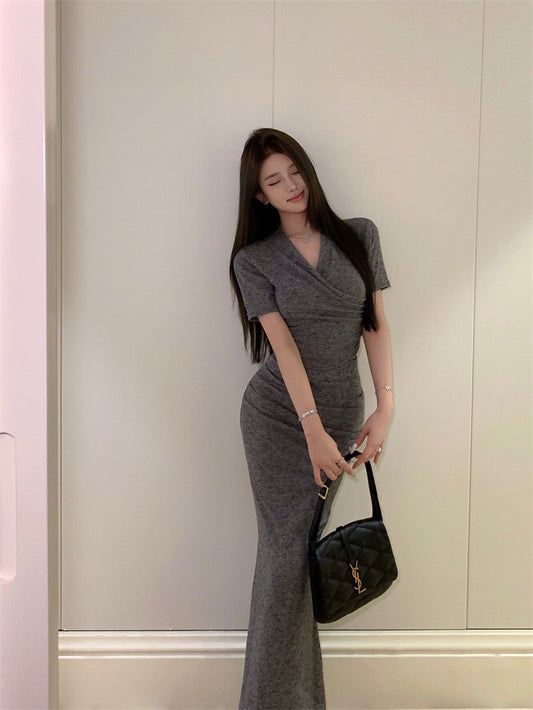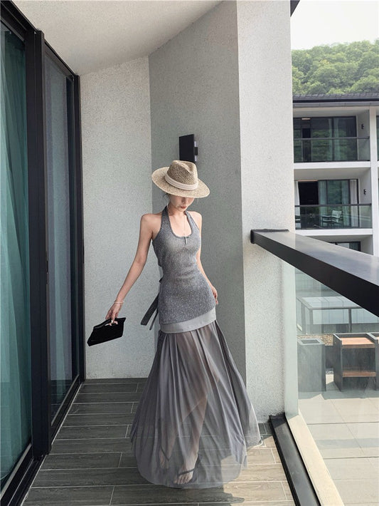 Na+ 歐美閃亮銀編美背背心 拼接透視半身裙 灰