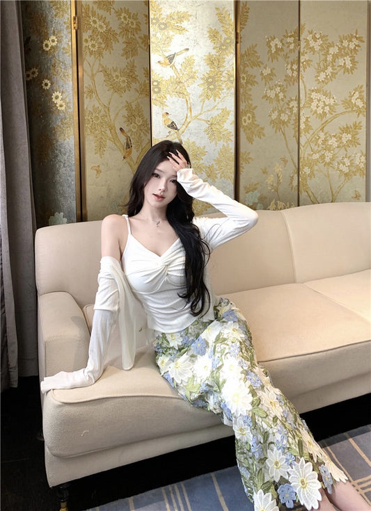 Na+ 富家千金 春色滿分重工手工刺繡花半身裙 顯瘦開衫 背心