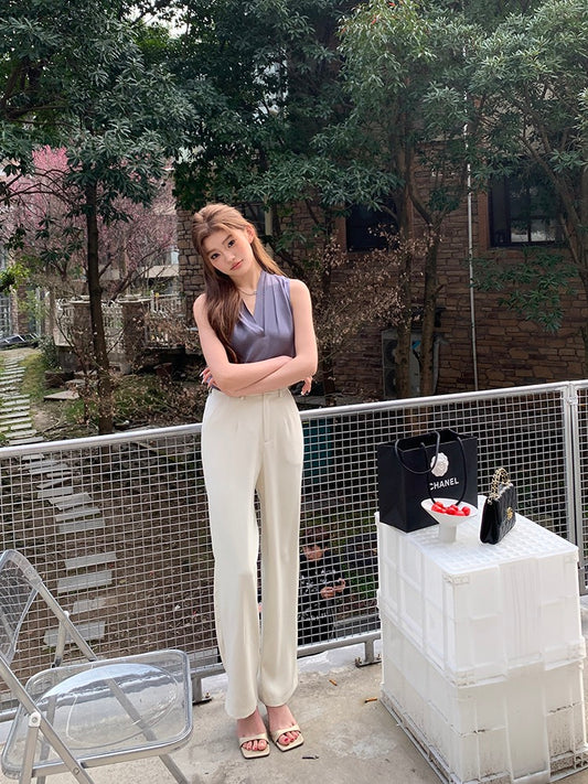 【Na+】約會日 海島絲v領垂墜感壓折上衣 顯瘦開叉休閒褲 米色