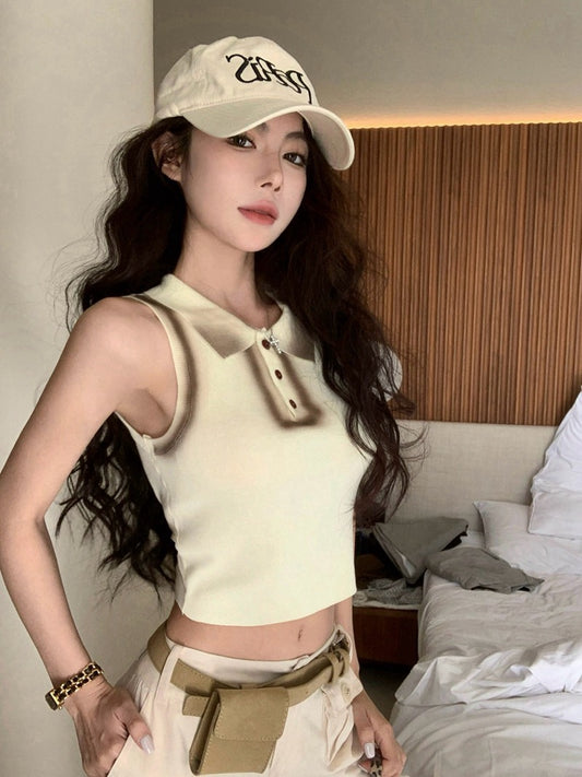 【Na+】復古港風 鈕扣polo領噴漆塗鴉背心 杏/藍/粉