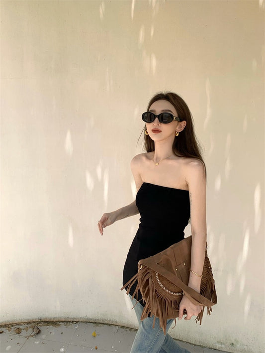 【Na+】復古顯瘦不規則開叉抹胸上衣 黑