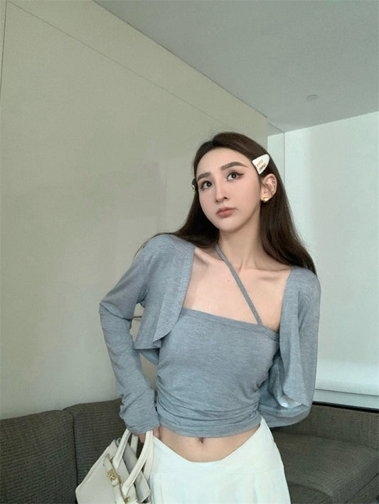 【Na+】日常百搭不規則肩帶平口背心外套兩件組 灰