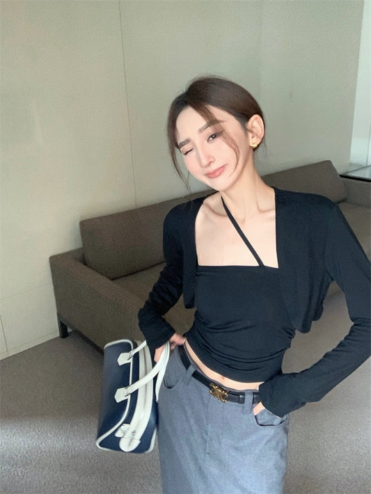 【Na+】日常百搭不規則肩帶平口背心外套兩件組 黑