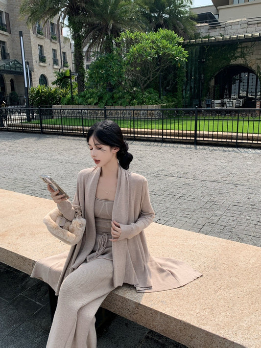 "Na+"歐美卡戴珊 溫柔軟糯針織3版設計 斗篷開衫 吊帶背心 休閒長褲-駝色