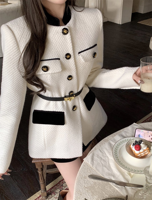 【Na+】撞色拼接圓領小香毛呢外套 白
