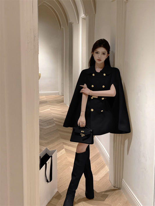 【Na+】晚宴女主 氣質雙排扣披風式毛呢大衣 黑