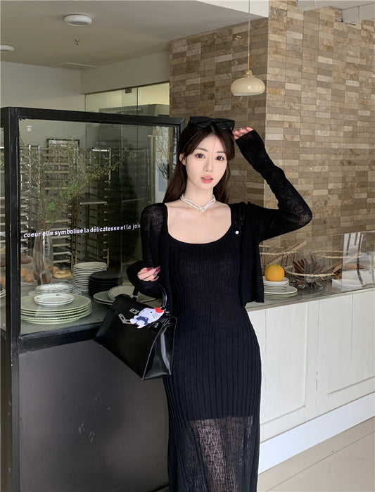 【Na+】溫柔花色紗線收腰設計顯收連身裙 同色外套 黑