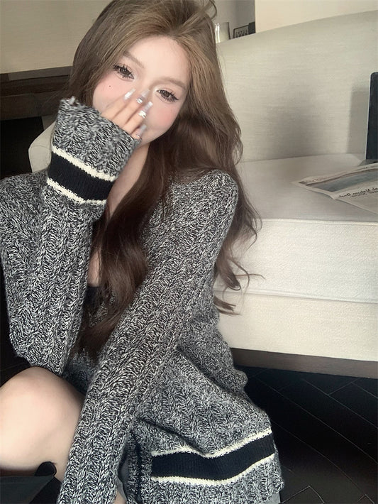 【Na+】慵懶英倫風經典條紋針織外套 灰