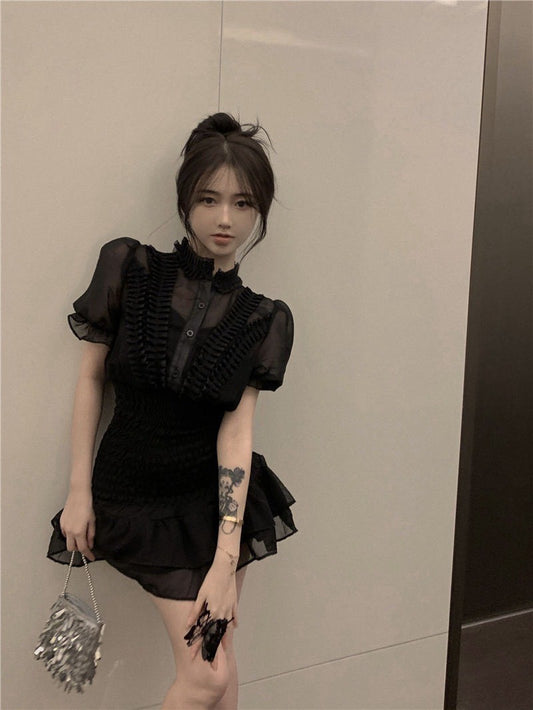 【Na+】毛絨性感網紗拼接連身裙 黑