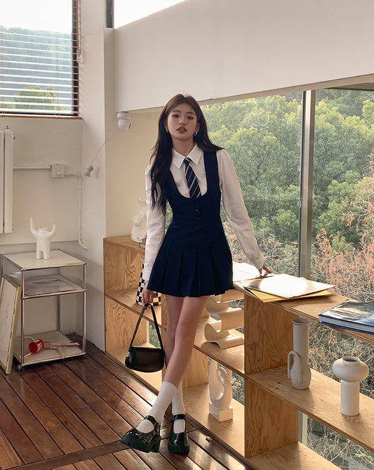 【Na+】學院風 U領背心式連身裙 白襯衫