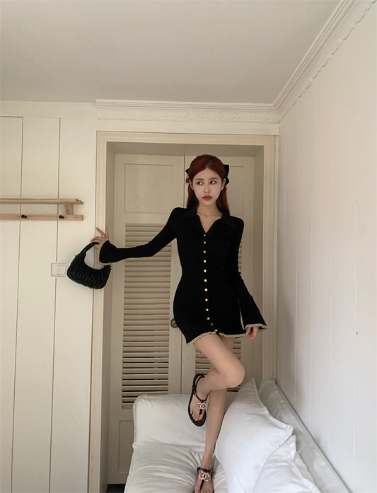 【Na+】Polo大V領 花邊繞邊針織連身裙