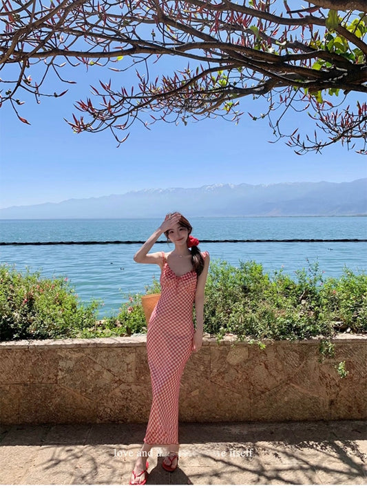 【Na+】紅熟櫻桃 法式收腰紅格紋魚尾連身洋裝
