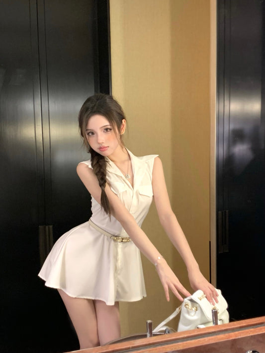"Na+"復古典雅女神 立體壓褶肌理交錯襯衫裙 米白