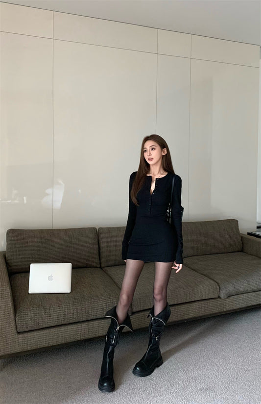 【Na+】圓領鈕扣修身連身裙 黑 2款長度