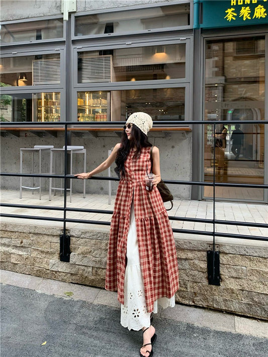 Na+ 高顏值日系 紅色格紋兩穿連身裙