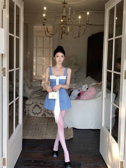 【Na+】牛仔甜心 蝴蝶結綁帶高腰連身洋裝