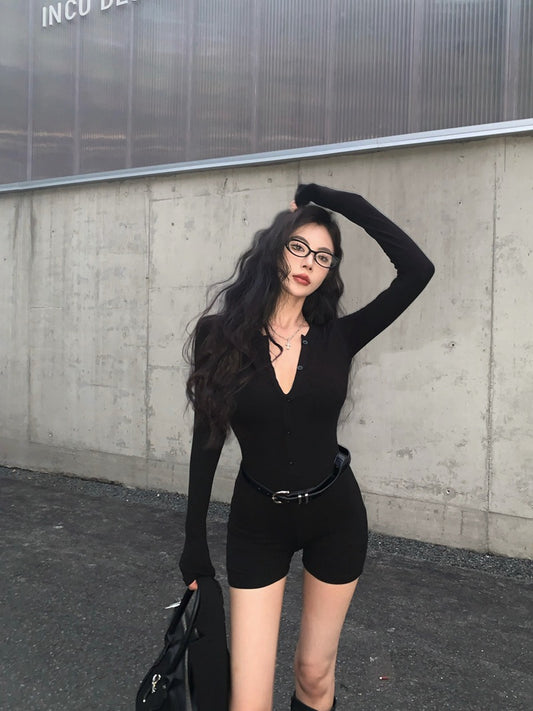 【Na+】排扣歐美彈力運動連身褲 黑