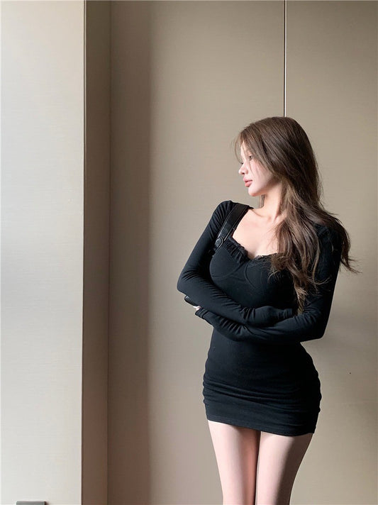 "Na+"御姐性感露肩 假兩件式蕾絲修身包臀裙 黑