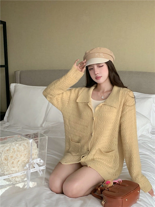 "Na+"奶黃顯白 慵懶口袋針織排扣外套