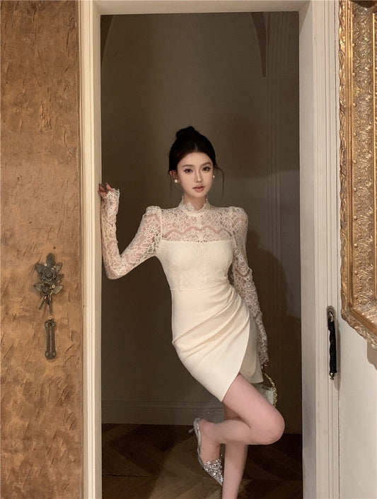 "Na+"古典晚宴會 蕾絲拼接半高領抓皺連身裙 白