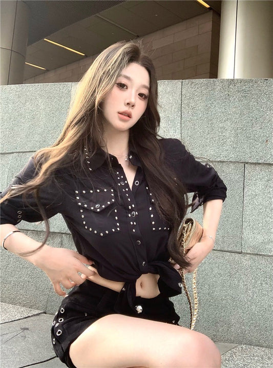 "Na+"女龐克 率性錨釘口袋黑色襯衫