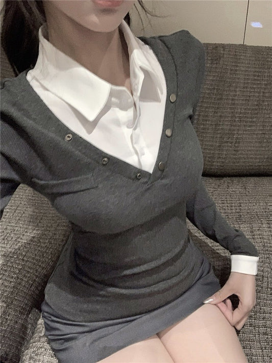 "Na+"學院美少女 假兩件式拼接顯瘦上衣 黑/灰