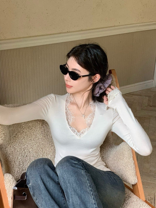 "Na+"內搭神器 性感V領蕾絲緹花長袖上衣 杏