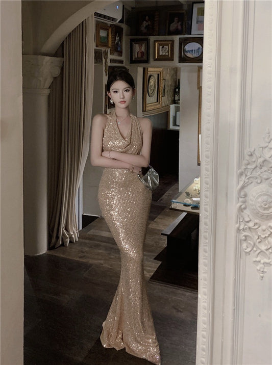 ''Na+''香檳生日裙 性感名媛掛脖挖背閃片連身裙