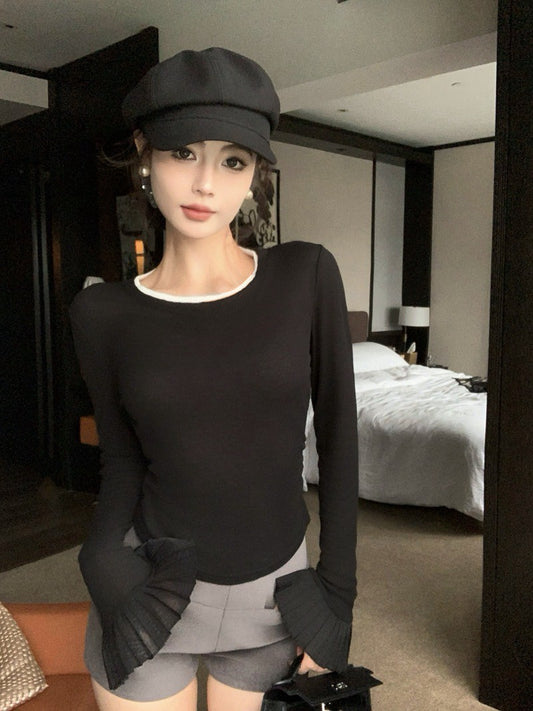 Na+ 人魚公主 氣質喇叭袖圓領彈力打底上衣 黑