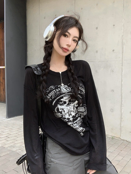 Na+ 俏皮防曬模式 圓領美式印花上袖上衣 黑