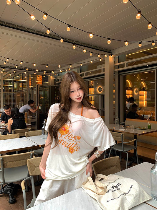 NA+ 休閒字母印花寬鬆上衣 內搭橙色內衣