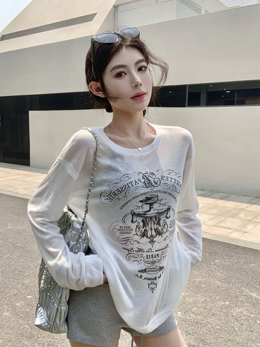 Na+ 俏皮防曬模式 圓領美式印花上袖上衣 白