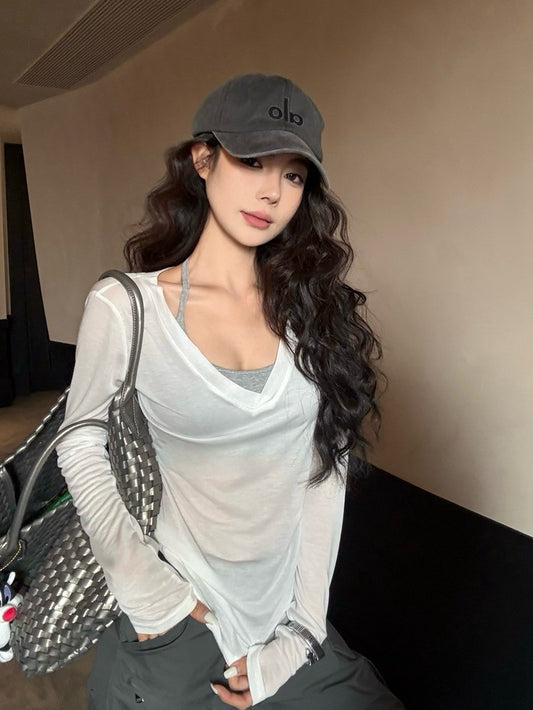 Na+ 休閒百搭 冰肌天絲V領上衣 灰
