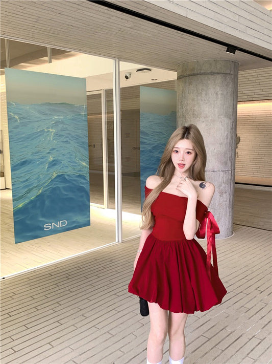 NA+ 公主sweetie甜美一字領花苞連身裙 紅