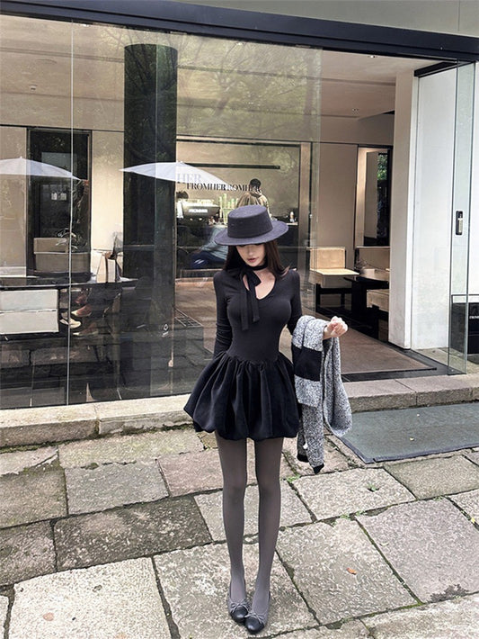 NA+ 千金歸來V領收腰花瓣澎澎赫本裙 黑
