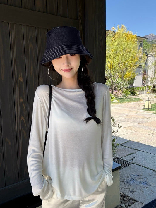 NA+ 基礎純色斜肩露腰長袖上衣 黑/咖/灰