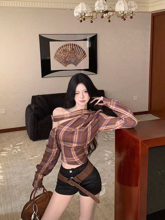NA+ 復古格紋多穿法斜肩上衣 復古咖